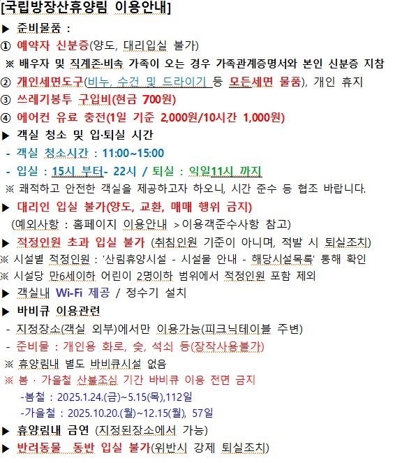 1. 사회적 거리두기 강화 추진 연장에 따른 국립자연휴양림 운영과 관련됩니다.2. 2022년 4월4일(월) 0시부터 기존 사회적 거리두기 강화 연장에 따라 전국적으로 10인까지만 사적모임이 가능해짐에 따라 아래 내용을 공유해드리오니 국립자연휴양림 운영에 참고하시기 바랍니다.- 아 래 -○ 대 상 :전국 국립자연휴양림 43개소○ 기 간 : 2022. 4. 4.(월) ~ 2022. 4. 17.(일), 2주간○ 주요내용[시설 운영 관련] - 전국 국립자연휴양림 43개소 판매대상 전 객실 운영 * 객실 내 사적 모임 정원 기준 초과 금지[사적모임 관련] (전국) 접종여부 관계없이 10인까지 사적모임 가능 * 다만, 동거가족, 돌봄(아동·노인·장애인 등) 등 기존의 예외범위는 계속 유지※ 사적모임 예외사항 - 거주공간이 동일한 가족 등이 모이는 경우(등본 거주지 기준) * 주소지가 다른 직계가족이 모이는 경우 사적모임에 해당 * 일시적으로 지방근무, 학업 등을 위해 가족의 일부 구성원이 타지역에서 생활 하고 있으나 주말, 방학기간 등에 함께 생할하는 경우 포함 * 동거가족일 경우, 만12세 이하 아동도 사적모임 예외 가능하며, 휴양림 내부규정 '만6세이하 아동의 경우 2명까지 인원산정하지 않는다'도 적용 가능 - 노인, 장애인 등 돌봄이 필요한 경우 * 사적모임 예외사항에 적용되지 않는 경우(동거가족 外)에는 만12세 아동도 1인 으로 산정) - 돌봄인력이 돌봄활동을 수행하는 경우(1인당 1명씩) * 돌봄인력이란 아이돌보미, 요양보호사, 활동지원사 등이며, 아이돌보미의 경우 「아이돌봄 지원법」제2조에 따라 정의된 아이돌보미만 해당됨 ※ 관련 문의사항이 있다면 숲나들e 고객지원센터(☎ 1588-3250) 및 방장산자연휴양림 (☎061-394-5523)으로 연락주시기 바랍니다. 감사합니다.