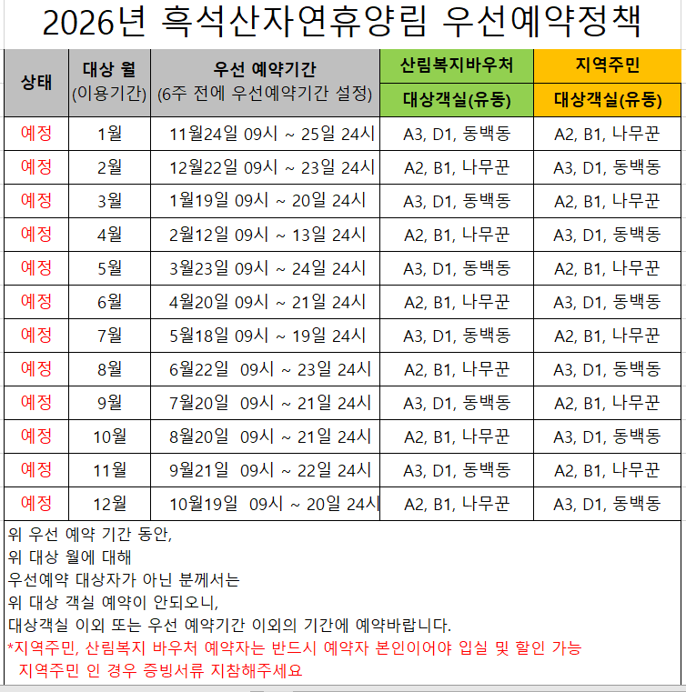 ★ 흑석산 자연휴양림내 바비큐 사용금지 안내산불조심기간 : 11월 1일 ~ 5월 15일흑석산 자연휴양림내 바비큐 시설은 전면 사용 금지됩니다.자연휴양림 내 시설물 보호 및 산림보호를 위해 해당 기간에는 사용할 수 없음을 알려드립니다. 아울러, 개인이 소유한 화로대 사용도 금지되오니 시설물 이용시 양해하여 주시기 바랍니다.