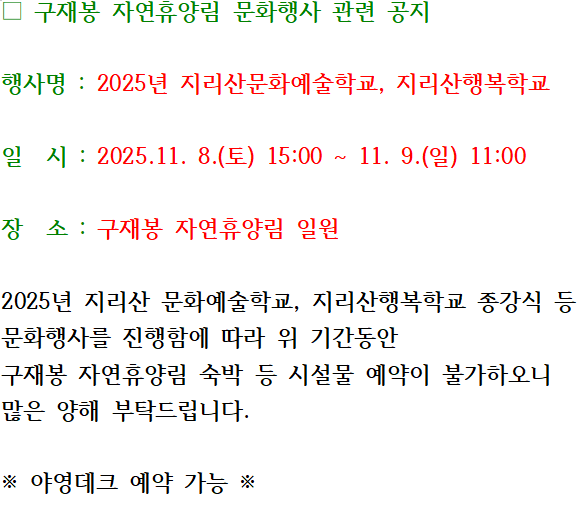 - [주소] 경남 하동군 적량면 중서길 60-81 구재봉자연휴양림