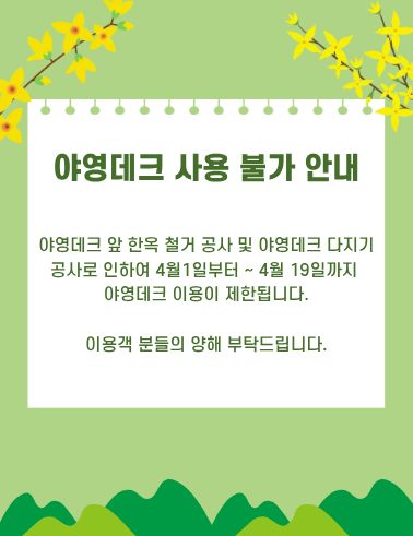 야영장 예약불가 안내 - 야영장 예약불가 시설 : 야영데크, 평상, 카라반야영장 - 야영장 예약불가 사유 : 야영데크앞 한옥시설 철거로 인한 소음 및 먼지, 공사 자재등 안전상의 이유 평상 주변 산불임도 공사 및 사방댐 증설 공사 - 야영장 예약불가 기간 25.09.01 ~ 25.12.31 공사 완료 시 따로 공지할 예정이며, 안전상의 이유로 부득이하게 판매 제한 하오니 이용객 분들의 너른양해 부탁드립니다. 고맙습니다.