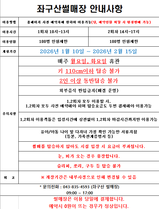 ○ 좌구산줄타기 : 2026년 1월 1일 ~ 2026년 2월 28일