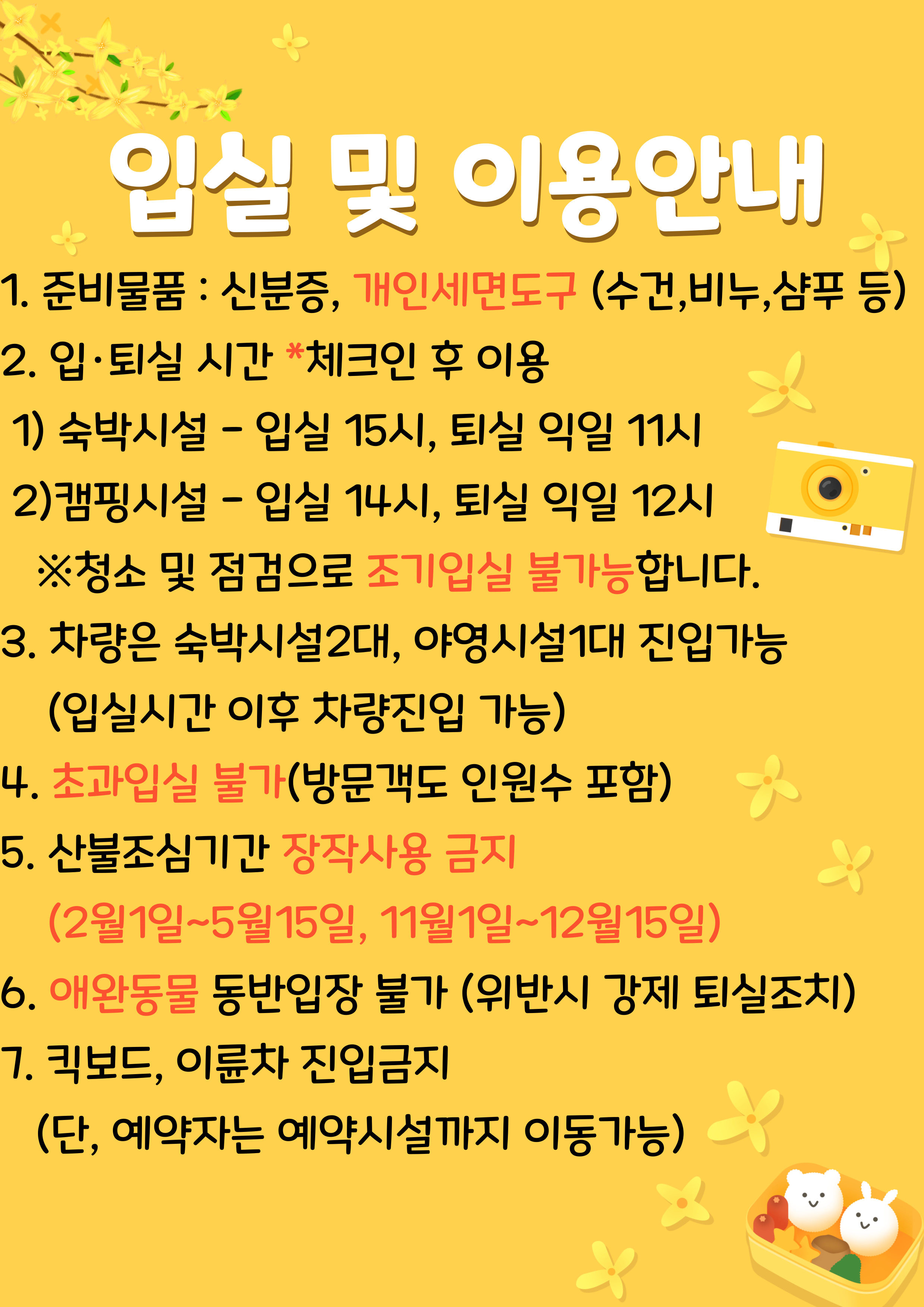 숲속의집 : 개인 세면도구(수건), 신분증 지참1. 우리 서운산 자연휴양림 입실시간은 숲속의집,카라반 오후3시이며, 퇴실시간은 익일 오전11시 입니다. 입실시간을 지키지 않으시면 입장이 거부될 수 있으니 꼭 지켜주시기 바랍니다. 캠핑장은 입실 오후2시, 퇴실시간은 익일 오전12시 입니다. 퇴실 시간을 준수하여 주시기 바랍니다. ★숙박시설 차량진입은 15시부터 가능합니다★2. 예약자분들은 본인 확인을 위한 증빙서류(신분증)를 꼭 지참해오셔야 합니다. (양도불가) ★할인적용의 경우 본인이 할인증빙을 준비하여 할인요청을 하셔야 할인됩니다★3. 입장인원을 준수하여 주시기 바랍니다. 초과인원 입장 불가(방문객포함) 미취학 아동 2명까지는 인원에 포함되지 않습니다. 예) 8인실 성인8명+미취학 아동 2명 가능4. 개인 세면도구(칫솔, 치약, 비누, 수건 등)는 제공하지 않으며, 휴양림 내부에 매점이 없는 관계로 필요하신 물건은 준비해오셔야 합니다5. 객실은 금연구역이며 객실 내에서는 고기나 생선을 구우실 수 없습니다. 고기나 생선은 객실 외부에 준비된 바베큐시설을 이용하시기 바랍니다.6. 차량 입장은 배정된 차량만 입실시간 이후 입장이 가능합니다. (숲속의집 2대, 그 외 시설 1대), 그 외 차량은 입구 "무료주차장"에 주차하시면 됩니다..7. 이륜차량(오토바이, 자전거) 출입이 불가합니다. 8. 반려동물 입장 불가. 9. 산불조심에는 장작사용이 불가능합니다. 매년 11월1일~12월15일, 2월1일~5월15일까지 10. 캠핑장(야영장)에서는 wifi 사용이 불가능합니다. -----------------------------------------------------------------------------------------------------○ 이용자 유의사항 안내1. 분실물 보관은 최대 세달입니다. 그 이후에는 폐기될 수 있으니 유의하시기 바랍니다.2. 타프, 텐트, 차량은 나무 밑에 자리잡으시면 나무 진액 등이 묻을수 있으니 유의하시기 바랍니다.3. 본인이 사용하는 시설 이외의 장소에서 텐트, 돗자리 등의 이용은 금지하며, 입장객은 텐트, 돗자리, 취식 등의 이용을 금지합니다.