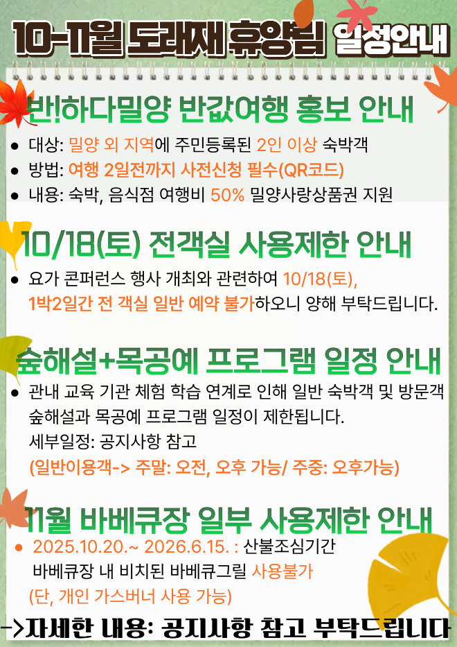 - 2025년 밀양 요가 콘퍼런스 행사와 관련하여 10.18(토), 1박 2일간 전 객실 일반 예약 불가하오니 양해 부탁드립니다.