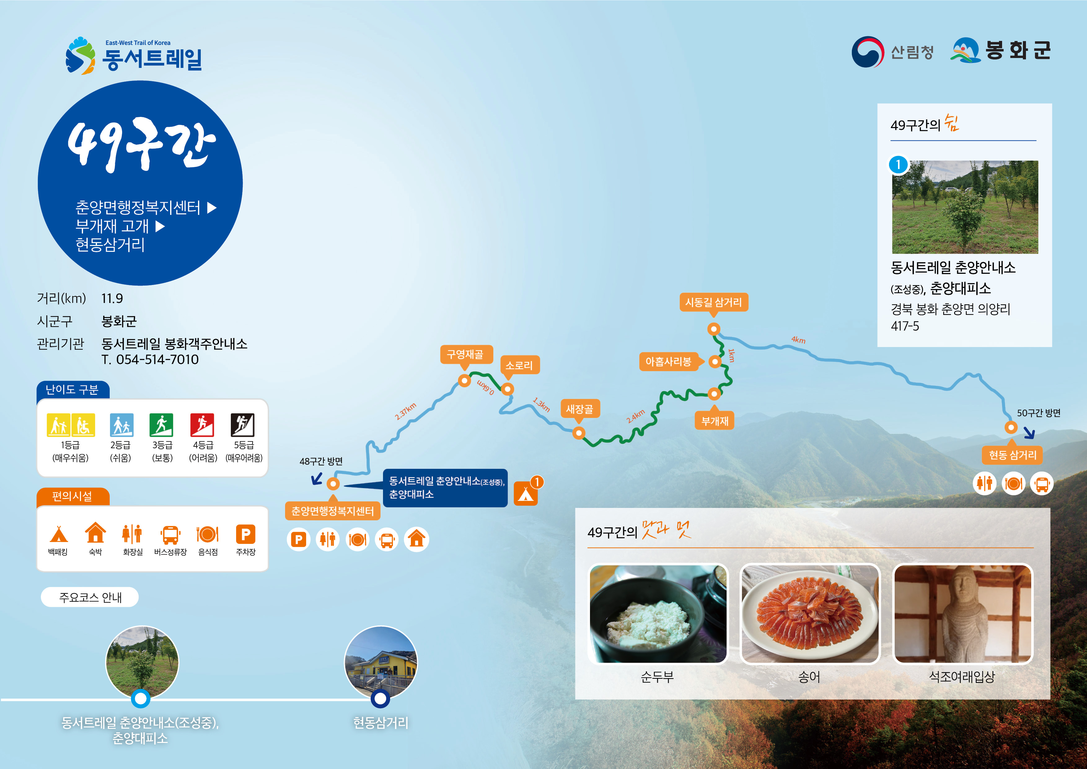 춘양면은 봉화군의 동북부 고산협곡에 위치하고 동쪽으로 소천면, 서쪽으로 물야면, 남쪽으로 법전면, 북쪽으로 강원도 영월군 상ㆍ하동면과 접하고 있습니다. 남북으로 형성된 긴협곡의 지형적 특색으로 기온이 낮아 한국의 시베리아라고도 불리며 봄이 짧습니다. *출처: 봉화군