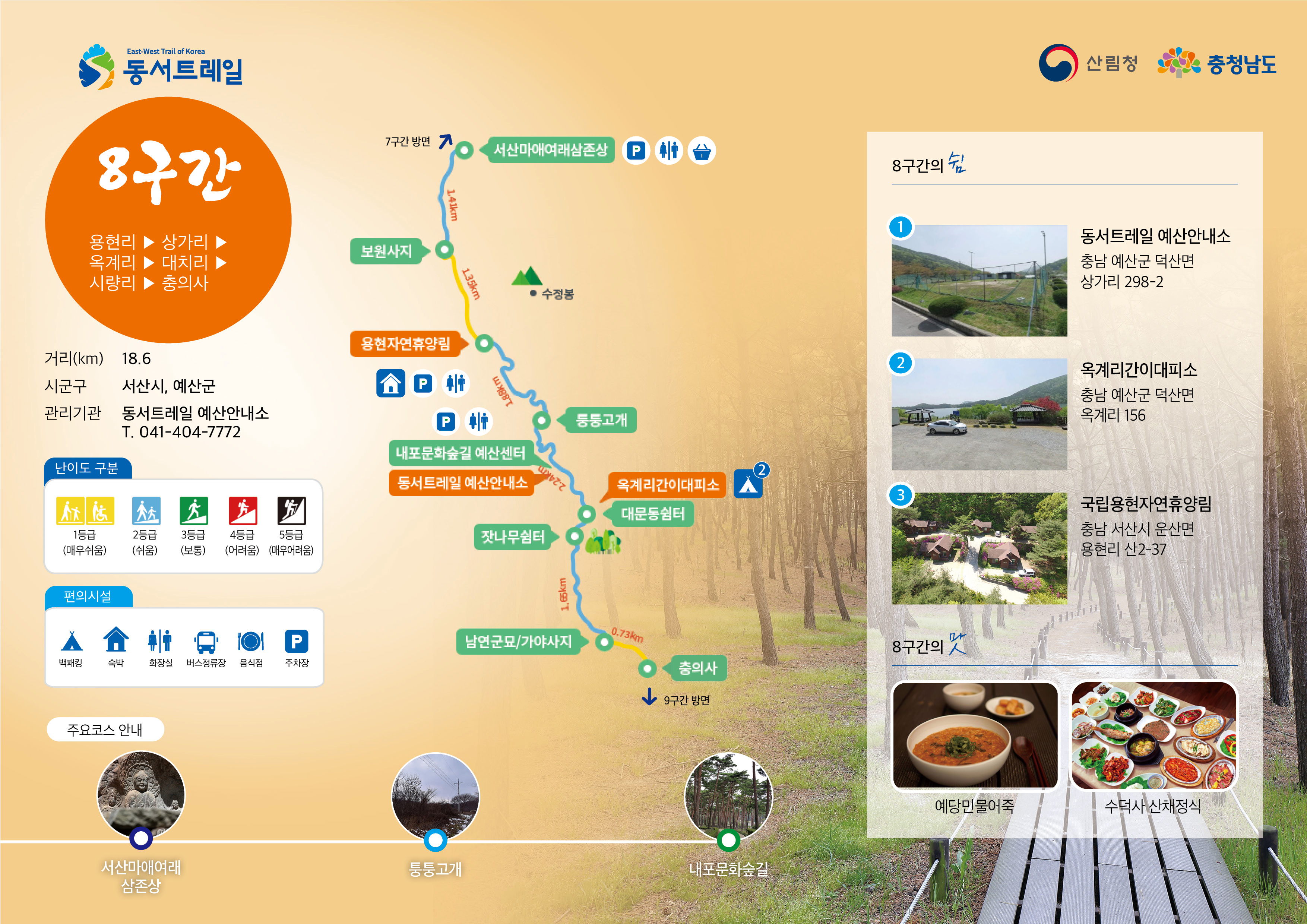 용현계곡 한가운데 자리해 심산유곡의 경치를 자랑하는 산림 휴양의 적지입니다. 능선을 따라 연결되는 등산로와 순환 임도는 서산 목장길과 연결되어 산책과 등산이 용이하고, 멀리 서해 바다를 조망할 수 있습니다.
