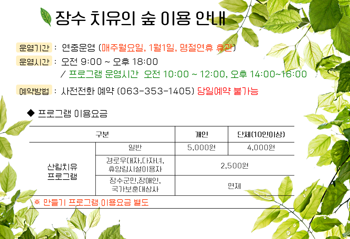 * 이용요금 : 일반 5,000원 /경로우대(65세)등 2,500원 /장수군민,장애인,국가보훈대상자 무료(증명서필수/중복할인없음)